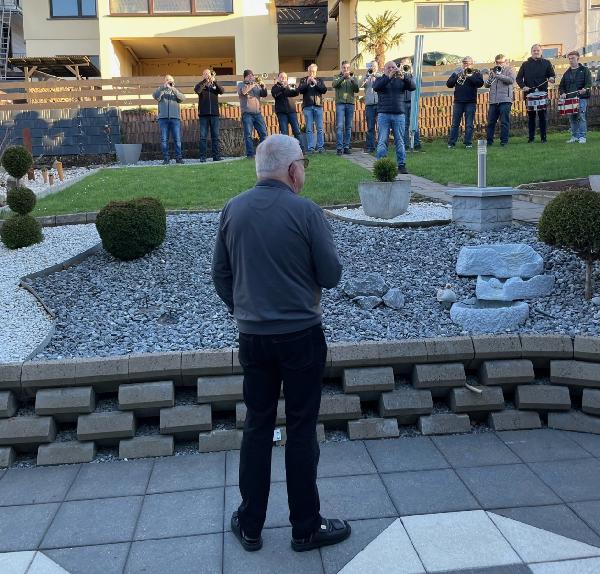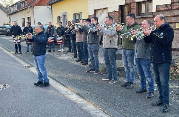 Der Fanfarenzug Eppelborn gratulierte mit einem Ständchen, auch der Löschbezirksführer und die Alterswehr schlossen sich der Gratulation an. Auch dirigierte das Geburtstagskind in gekonnter Manier ein Lied des Fanfarenzuges