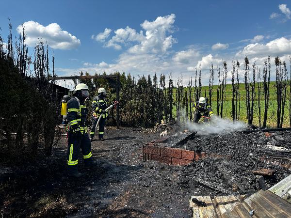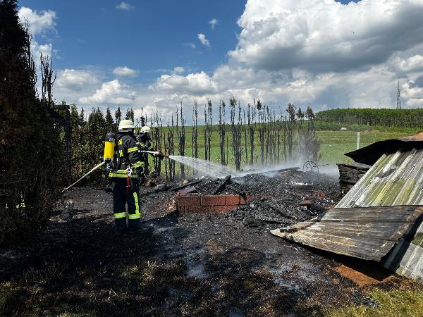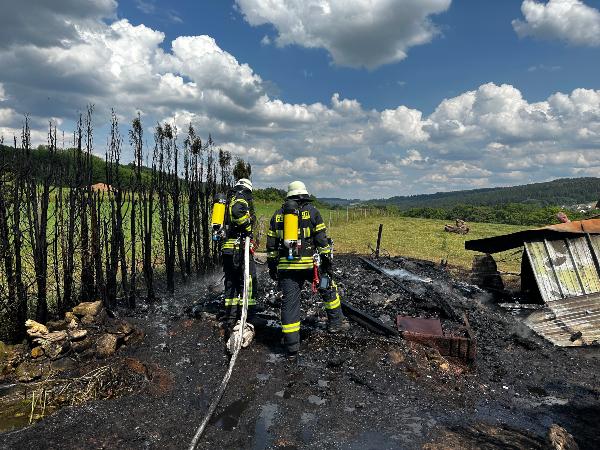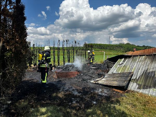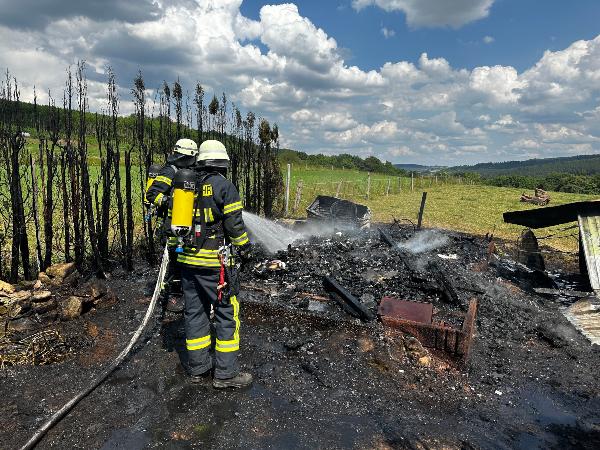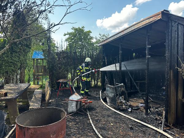 Bereits auf der Anfahrt zur Einsatzstelle meldete der Einsatzleiter an die Leitstelle auf dem Winterberg, dass eine starke Rauchentwicklung und Flammenschlag sichtbar sind. Beim Eintreffen konnten die Einsatzkräfte schnell eine erste Entwarnung geben. Auf dem Hof brannten ein Gartenhaus und ein Unterstand, die Scheune war zum Glück nicht vom Feuer betroffen.