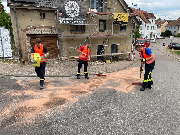 Da der Baubetriebshof um diese Zeit nicht mehr erreichbar war, wurde von der Polizei gegen 17:06 Uhr die Feuerwehr hinzugerufen. Die Einsatzkräfte aus dem Löschbezirk Wiesbach nahmen den ausgetretenen Dieselkraftstoff mit Bindemitteln auf. Die Einsatzstelle wurde abgesichert und eine Spezialfirma zur Reinigung der Fahrbahn hinzugerufen.