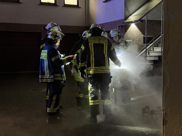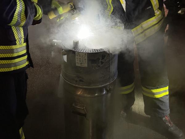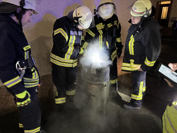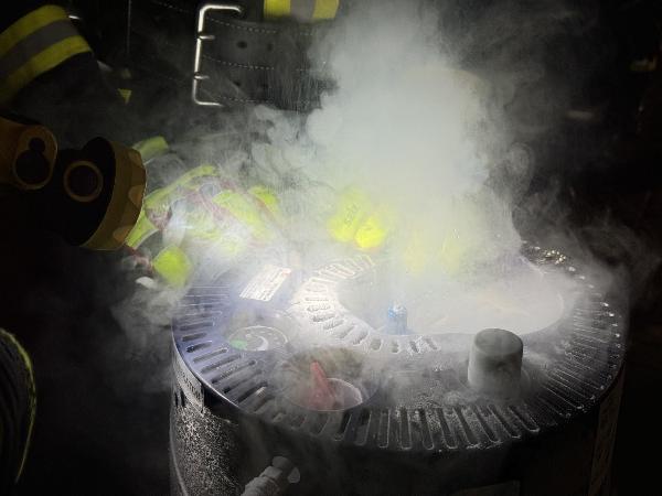 Die Einsatzkräfte brachten den Behälter ins Freie und versuchten, ein weiteres Austreten des flüssigen Sauerstoffs aus dem 45 Liter fassenden Behälter zu verhindern, jedoch ließ sich das offenbar defekte Ventil nicht mehr schließen.