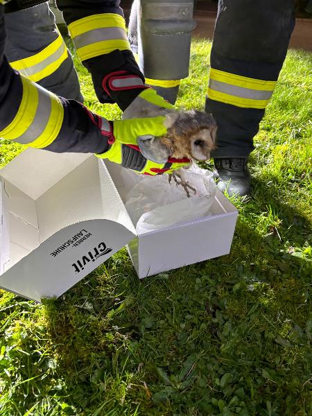 Die Kameraden zerlegten über die Drehleiter aus Lebach das Fallrohr und befreiten das hilflose Tier. Es wurde in einen Karton gesetzt und zurück ins Nest gebracht.