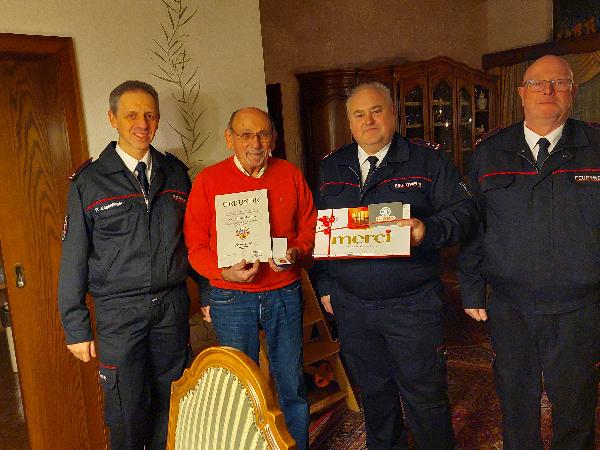 Brandmeister Ferdinand Ulrich trat mit 16 Jahren am 30.12.1958 in die Freiwillige Feuerwehr ein. Seine aktive Dienstzeit endete am 02.11.2002 mit der Übernahme in die Altersabteilung des Löschbezirk Dirmingen. Heute war es für uns eine besondere Ehre die besondere Ehrung durchzuführen und die Grüße des gesamten Löschbezirks zu überbringen.