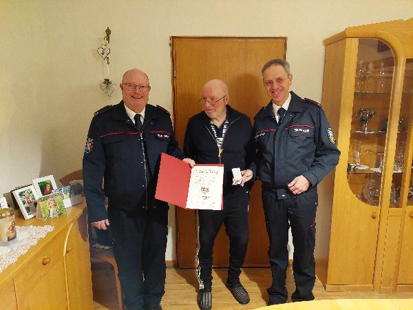 Hans-Werner Guthörl und Pascal Engeldinger verlasen die Urkunde und überreichten die Ehrenspange. Des weiteren übergaben Sie ein Präsent von allen Kameraden und Kameradinnen des Löschbezirk Dirmingen mit den besten Wünschen für die Zukunft.