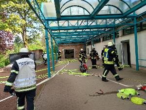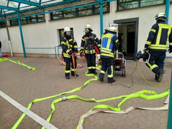 Waren bei der Räumübung real alle Personen in Sicherheit gebracht worden, wurde nun angenommen, dass im Heizungsraum der Schule ein Feuer ausgebrochen ist, der Hausmeister vermisst wird, ein Kind im Rollstuhl sich noch im Gebäude befindet und eine Schülerin aus Angst weggelaufen ist. Im Laufe der Rettungs- und Brandbekämpfungsmaßnahmen verunfallt ein Feuerwehrangehöriger unter Atemschutzgerät, ein sogenannter Atemschutzunfall liegt dann vor.