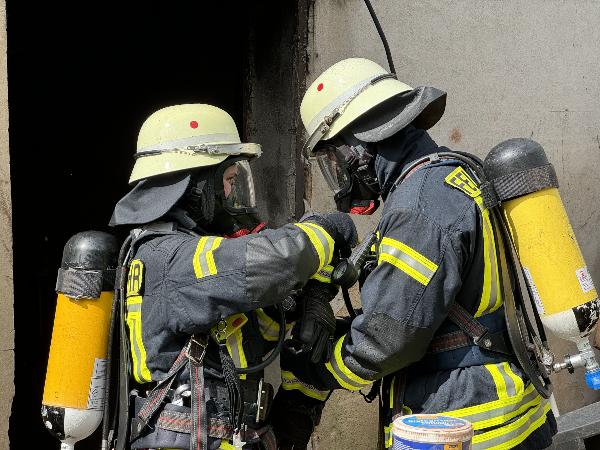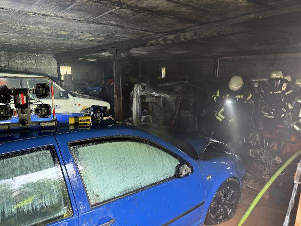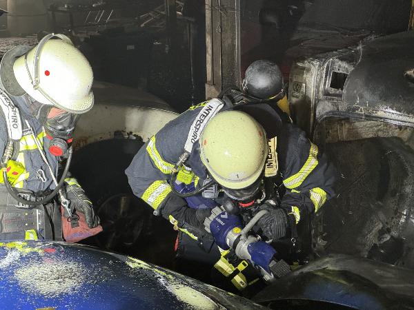 Unter Atemschutz gelange des den beiden Trupps, den eigentlichen Brandherd in der völlig verrauchten Werkstatt zu lokalisieren. Mit 2 Rohren konnte der Brand gelöscht werden. Dazu musste unter anderem die Motorhaube eines in der Halle abgestellten Fahrzeugs mit einem hydraulischen Spreizer geöffnet werden. Mit Überdrucklüftern wurde die Werkstatt dann vom Brandrauch befreit.