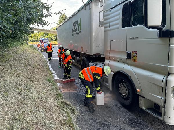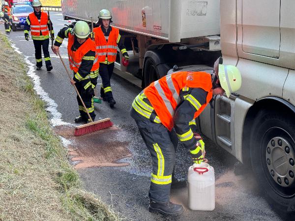 Die Einsatzkräfte sicherten die Einsatzstelle gegen den fließenden Verkehr und nahmen den ausgetretenen Kraftstoff auf. Die Einsatzstelle wurde an die Polizei übergeben.
