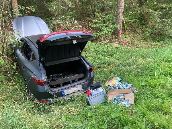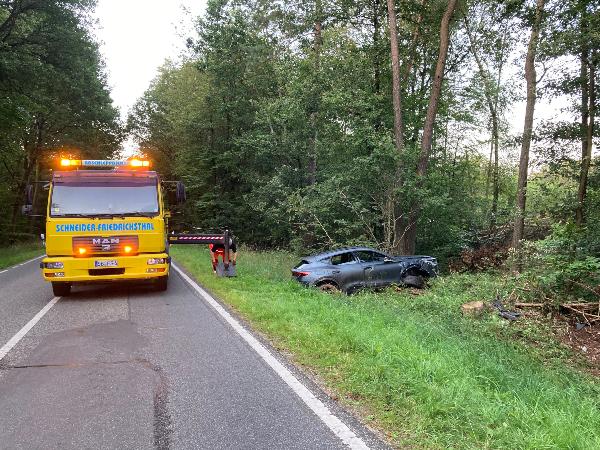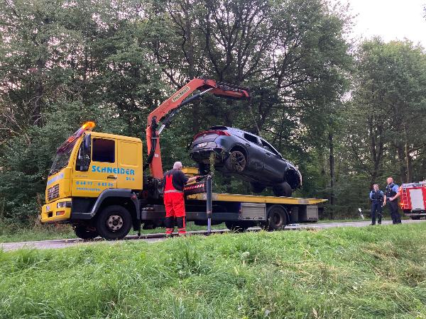 Beim Eintreffen war der verletzte Fahrer schon mit dem Rettungswagen auf dem Weg ins Krankenhaus. Ausgelaufene Betriebsstoffe waren auf der Straße keine vorzufinden und auf dem zugewachsenen Waldboden nicht sichtbar.