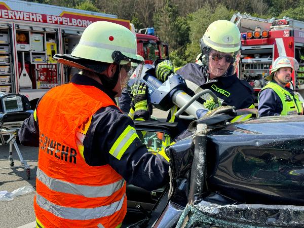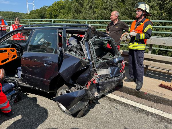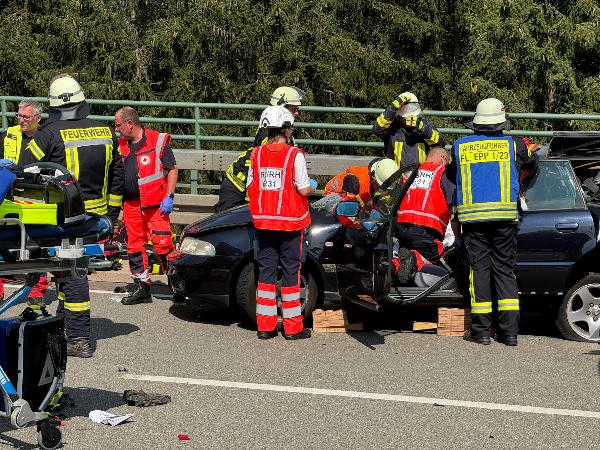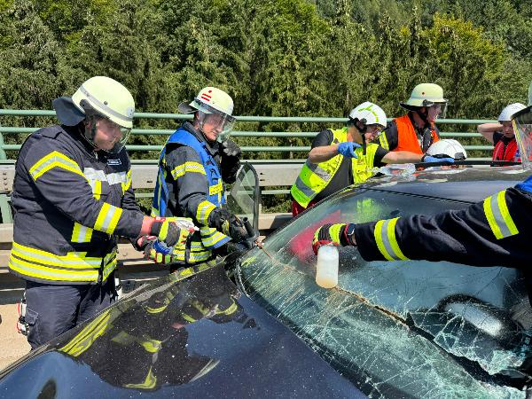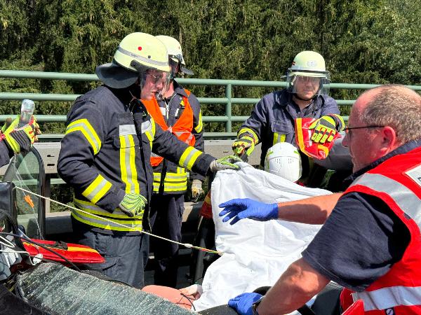 Beim Eintreffen der Feuerwehr waren beide Insassen des Pkw ansprechbar und nicht eingeklemmt. Rettungsdienstlich ausgebildete Einsatzkräfte der Feuerwehr übernahmen die medizinische Erstversorgung bis zum Eintreffen des Rettungsdienstes. Während der Fahrer ohne Hilfsmittel aus dem Fahrzeug befreit werden konnte, musste zur Rettung der Beifahrerin in Absprache mit dem Notarzt das Dach des Fahrzeuges sowie die Seitentüren entfernt werden. Dabei war die im Fahrzeug deponierte Rettungskarte eine große Hilfe.