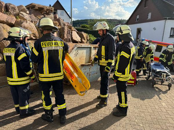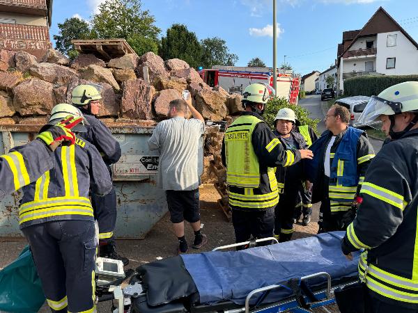Ein Anwohner war bei Arbeiten aus rund zwei Metern Höhe in einen zum Teil mit Steinen befüllten Container gestürzt und hatte sich dabei Verletzungen zugezogen.