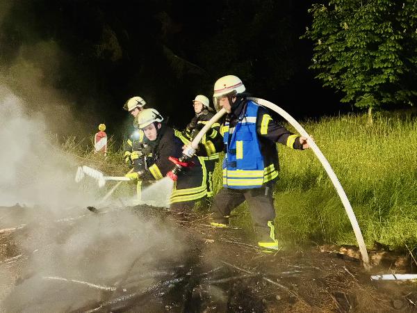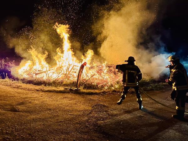 Die Feuerwehr fand einen großen Haufen Holzreste vor, die dort nach einem früheren Sturmschaden gelagert worden waren und nun in Vollbrand standen. Flammen und Rauch waren schon von weitem aus sichtbar.