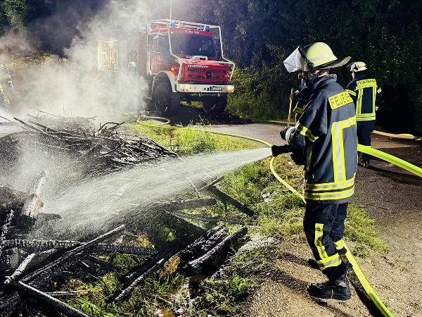 Durch den schnellen Einsatz der Feuerwehr konnte ein Übergreifen des Brandes auf den angrenzenden Wald verhindert werden. Die Brandursache ist unbekannt, Brandstiftung kann nicht ausgeschlossen werden. Der Einsatz war für die Feuerwehr nach rund 2 Stunden beendet.