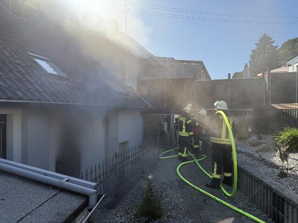 Parallel zur Brandbekämpfung im Inneren wurde ein Löschangriff von außen vorgenommen. Das Küchenfenster auf der Gebäuderückseite war durch die enorme Hitze bereits geplatzt, Flammen schlugen aus dem Fenster und drohten, auf das Dach überzugreifen.