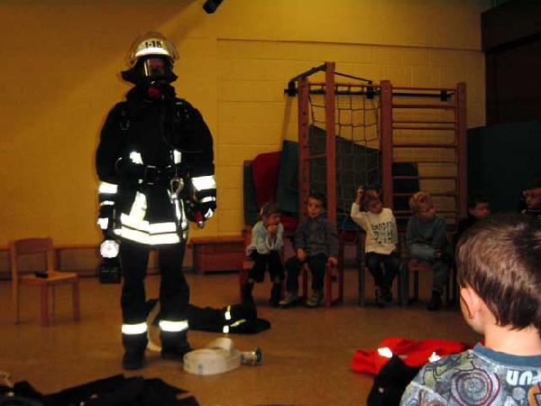 Mit großen Augen und viel Begeisterung waren die Kinder bei der Sache, als sie mit vielen mitgebrachten Ausrüstungsgegenständen einen Feuerwehrmann komplett ausrüsten sollten.