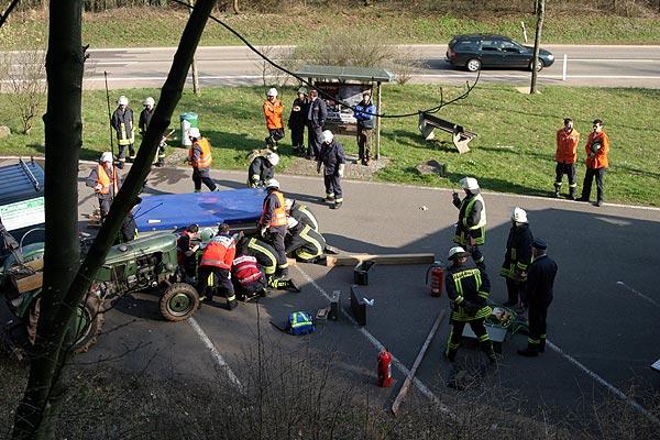 Der Einsatzleiter des Löschbezirks Dirmingen, der als erstes am Einsatzort eintraf, erkannte schnell das ganze Ausmaß der Situation und forderte den Löschbezirk Eppelborn zur Unterstützung an. Gemeinsam mit den Rettungssanitätern des Löschbezirks Eppelborn begann die Sichtung und Erstversorgung der Verletzten. Erst nach der Stabilisierung der Patienten konnte die Befreiung unter Einsatz von pneumatischen und hydraulischen Hebern durchgeführt werden.