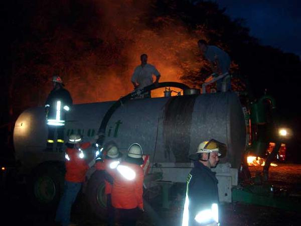Zum Einsatz kamen wie schon bei der letzten Waldbrandübung 2 Tankanhänger von ortsansässigen Landwirten mit einem Fassungsvermögen von ca. 15000 und 6000 Litern. Mit diesen und den Tanklöschfahrzeugen aus Eppelborn und Thalexweiler wurde ein Pendelverkehr eingerichtet, da an dieser entlegenen Einsatzstelle die Wasserversorgung weder durch Hydranten noch durch offene Gewässer hergestellt werden konnte.