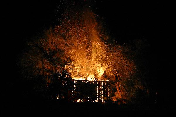 Als die ersten Einsatzkräfte die Einsatzstelle erreichten, stellte sich heraus, dass nicht die Bäume selbst, sondern eine unter den Bäumen errichtete Holzhütte im Vollbrand stand. Mehrere Meter hoch schlugen die Flammen unter den Bäumen empor.