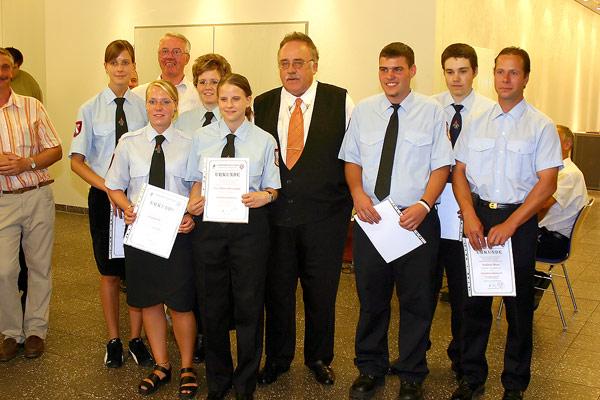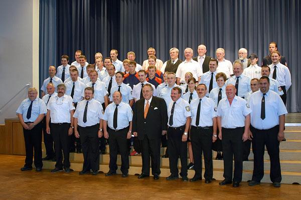 Bürgermeister Lutz zeichnete 15 Kameraden für ihre langjährige Mitgliedschaft mit der gravierten Ehrenuhr der Gemeinde aus: Für 20 Jahre aktiven Dienst waren dies Thomas Becker, Dirk Bruckhaus, Marko Alt, Markus Leidinger, Tino Kienel, Reinhard Fuchs, Helmut Meyer und Thomas Etringer, für 40 Jahre aktiven Dienst Oswald Schweitzer, Willi Brill, Josef Bettscheider, Herbert Hahn, Otmar Groß, Günter Neu und den Wehrführer der Gemeinde, Hermann Josef Recktenwald.