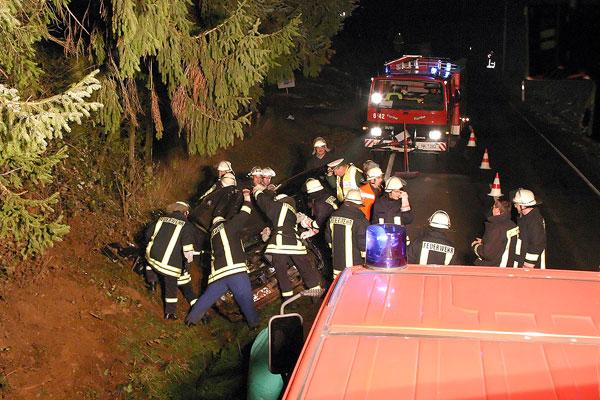 Die Einsatzstelle musste gegen den fließenden Verkehr in der Dunkelheit abgesichert und ausgeleuchtet werden. Dann wurde der auf der Seite in einem Straßengraben liegende PKW aufgerichtet, bevor die Zündung abgestellt und die Batterie abgeklemmt werden konnte. Die Einsatzkräfte beseitigten Trümmerteile der Fahrzeuge von der Straße und unterstützten das Abschleppunternehmen beim Verladen der Unfallfahrzeuge.