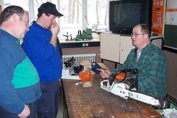 Der technische Ausbildungsteil beinhaltete die fachgerechte Wartung, Pflege und Durchführung einfacher Reparaturen an der Motorsäge. Die Teilnehmer lernten, welche Möglichkeiten zum Schärfen der Kette es gibt, welche regelmäßigen Prüfungen durchzuführen sind und wie die Motordrehzahl optimal eingestellt wird. Denn mit einer gut gewarteten, betriebsbereiten Motorsäge kann nicht nur sicher gearbeitet werden, die Lebensdauer von Säge und Zubehör wird dadurch auch erheblich gesteigert.