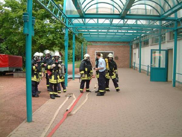 Grosse Teile des Schulgebäudes wurden mit Disko-Nebelmaschinen verqualmt, um den Einsatzkräften ein realistisches Übungsszenario zu bieten. Ganz wie im realen Einsatz mussten systematisch alle Klassenräume nach Personen abgesucht werden. Stellenweise war der Rauch so dicht, dass die Feuerwehrmänner sich nur noch schemenhaft an den Reflektoren der Einsatzkleidung erkennen konnten.