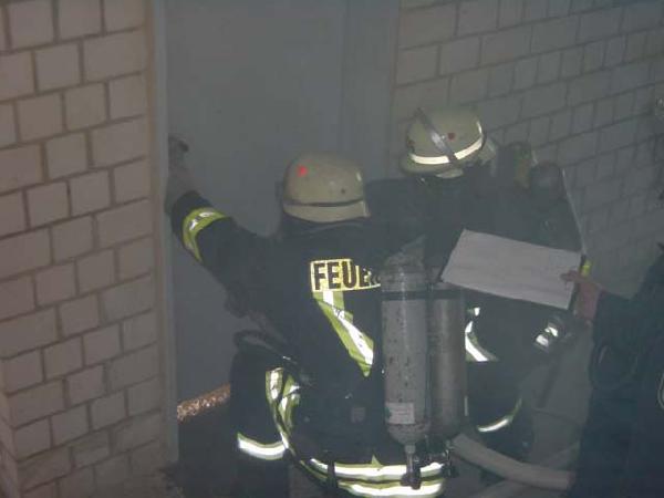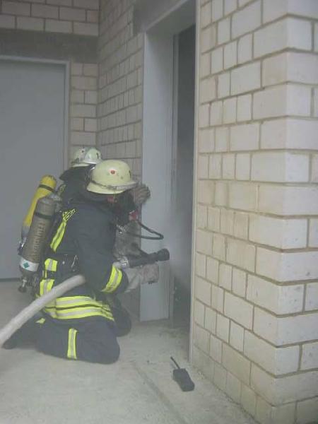 Am Vormittag stand die Brandbekämpfung auf dem Lehrplan. Dazu wurde das Trümmerhaus auf dem Schulgelände mit Nebelmaschinen verqualmt, um eine realistische Übungssituation zu bieten. Besonders beeindruckend war vor allem für die jüngeren Kameraden das Vorgehen mit "Wasser am Rohr" im Innenangriff, dass sich sonst in "trockenen" Übungen nur schwer darstellen lässt. Auch das richtige Niederschlagen von Rauchgasen beim Öffnen der Zimmertür konnte geübt werden.