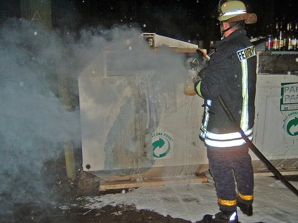 Die bereits wenige Minuten nach der Alarmierung eintreffenden Einsatzkräfte konnten die Flammen unter Einsatz von Löschschaum schnell bekämpfen. Ein Übergreifen des Feuers auf benachbarte Container konnte verhindert werden. Im Anschluss wurde der Altpapiercontainer mit einem Fahrzeug des Gemeindebauhofes zum Baubetriebshof gebracht, um ihn dort zu öffnen und verbliebene Glutnester abzulöschen. Der Einsatz war für die Feuerwehr gegen 6.15 Uhr beendet.