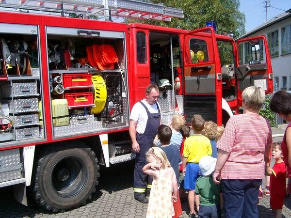 Im Anschluss an die Übung galt das Interesse der Kinder vor allem den Feuerwehrfahrzeugen. Viele Fragen wurden gestellt und natürlich wollte auch jeder mal ein Strahlohr halten. Zwischenzeitlich unterrichtete Stefan Morbe die Betreuerinnen über die Möglichkeiten der Brandvermeidung und der Bekämpfung von Entstehungsbränden mit den im Kindergarten vorhandenen Löschmittel.