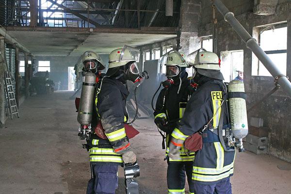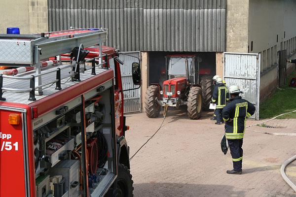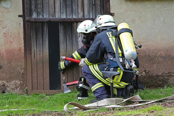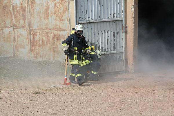 Sofort rüsten sich Einsatzkräfte aus Dirmingen und Eppelborn mit Atemschutzgeräten aus, um in der brennenden Scheune nach dem immer noch vermissten Landwirt zu suchen. Doch der Weg durch das Scheunentor ist durch einen Traktor versperrt. Mit der Seilwinde des Rüstwagens muss das Hindernis erst aus dem Weg gezogen werden, damit die Einsatzkräfte in das Innere der Scheune vordringen können.