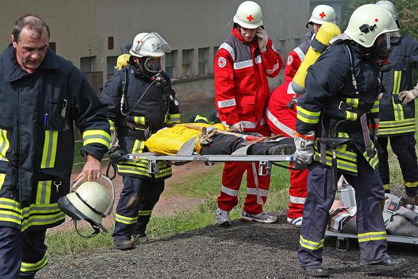 Während dessen beginnen die Feuerwehrleute aus Humes, Dirmingen und Bubach-Calmesweiler mit der Rettung der verletzten Feuerwehrmänner aus dem verunfallten Löschfahrzeug. Auch die Befreiung der in ihrem Wagen eingeklemmten Frau des Landwirts wird vorbereitet. Möglichst schonend wird die Frau aus ihrem Wagen befreit und dem DRK zur weiteren Versorgung übergeben.