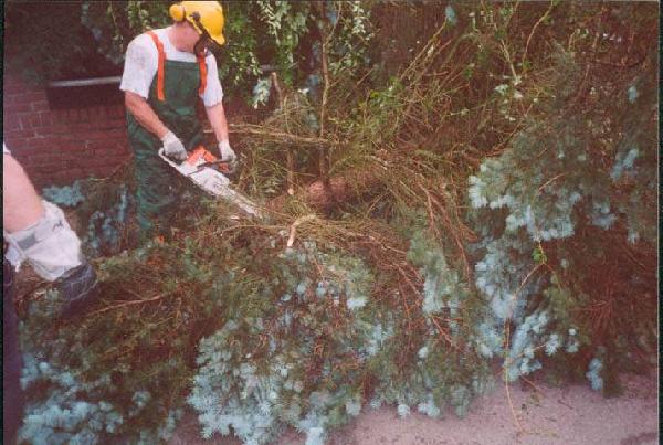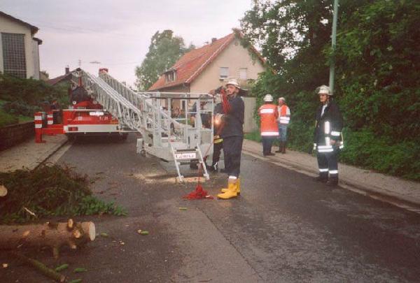 Da ein Fällen des Baumes mit der Motorsäge wegen vorhandenen Starkstromleitungen und umliegender Bebauung nicht in Frage kam, wurde die Drehleiter aus Illingen zur Unterstützung angefordert.