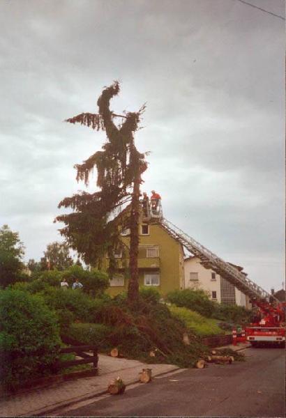 Der betroffene Baum konnte von der Drehleiter aus stückweise zurückgeschnitten und so die Gefährdung beseitigt werden.