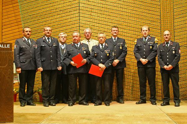 Recktenwald wiederholte noch einmal zwei wichtige Ehrungen im Auftrag des Bürgermeisters: Stephan Rein wurde vom Oberlöschmeister zum Brandmeister befördert, Löschmeister Wolfgang Götzinger erhielt eine Auszeichnung für seine 35jährige Mitgliedschaft in der Feuerwehr.