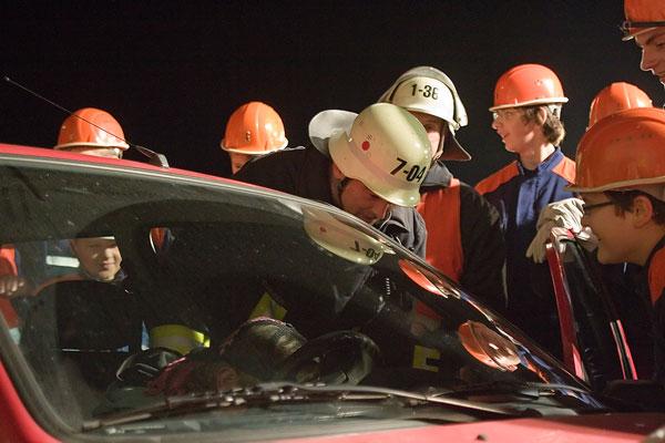 Genau wie bei den Großen baute der Feuerwehrnachwuchs zuerst Scheinwerfer auf, um die Einsatzstelle auszuleuchten. Mit einem Feuerlöscher und einem Strahlrohr wurde der Brandschutz sichergestellt, sollte es durch Funken zu einer Entzündung von Kraftstoff kommen. Nachdem ein Zugang zu den Insassen geschafft war, konnten sie aus dem Fahrzeug gerettet und mit einer Trage zur weiteren Versorgung gebracht werden.