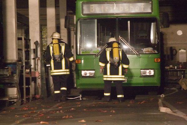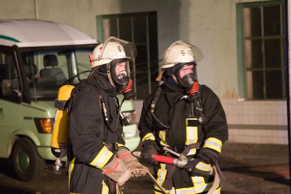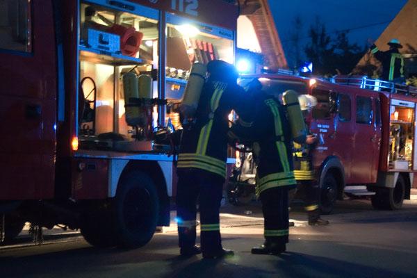 Ausgerüstet mit Atemschutzgeräten beginnen die ersten Trupps mit dem Durchsuchen von Keller- und Erdgeschoss. Parallel dazu wird vor dem Gebäude die Einsatzstelle mit Scheinwerfern ausgeleuchtet. Ausgehend von zwei Hydranten wird die Wasserversorung aufgebaut und auch mit der Brandbekämpfung von aussen begonnen.