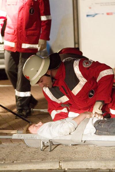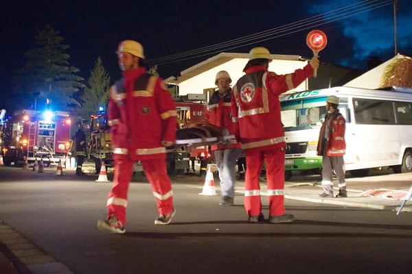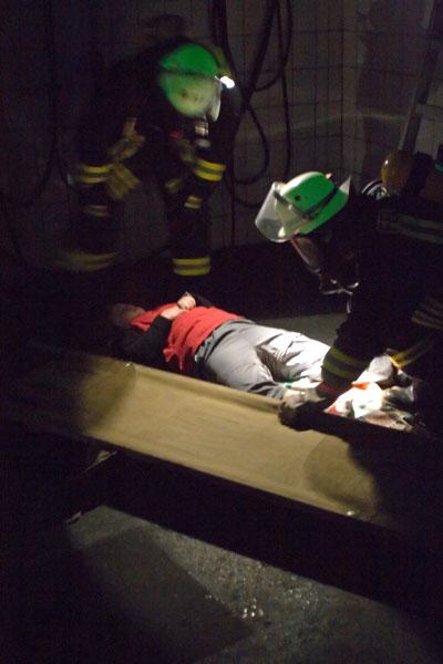 Trotz der Weitläufigkeit der Halle sind die Vermissten schnell gefunden. Mit Tragen werden sie von den mit Atemschutzgeräten ausgerüsteten Feuerwehrleuten ins Freie gebracht, wo bereits die Sanitäter warten. Nach einer ersten Sichtung der Verletzungen geht es direkt weiter in eine als Verbandsplatz umfunktionierten Garage. Hier werden sie weiter versorgt und für den Transport in Krankenhäuser vorbereitet.