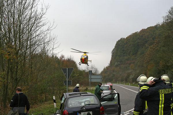 Gemeinsam mit dem inzwischen eingetroffenen Notarzt und Rettungsassistenten wird die eingeklemmte Fahrerin von Rettungssanitätern der Feuerwehr erstversorgt. Nach der Gabe von Schmerz- und Beruhigungsmitteln kann dann die Rettung der jungen Frau beginnen. Dazu müssen die Fahrertür sowie der vordere Teil des Wagendaches mit hydraulischen Rettungsgeräten entfernt werden. In enger Zusammenarbeit mit dem Notarzt des ebenfalls zur Unfallstelle entsandten Rettungshubschraubers gelingt es nach gut einer halben Stunde, die Fahrerin so schonend wie möglich zu befreien.