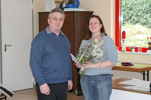 Auch Gemeindejugendbetreuer Karl Paul gratulierte den Jugendfeuerwehrmitgliedern und dankte ganz besonders der Ausbilderin Claudia Schorr, die den Unterricht an den beiden vergangenen Samstagen leitetet und überreichte zum Dank einen Blumenstrauß für den kurzweiligen Unterricht.