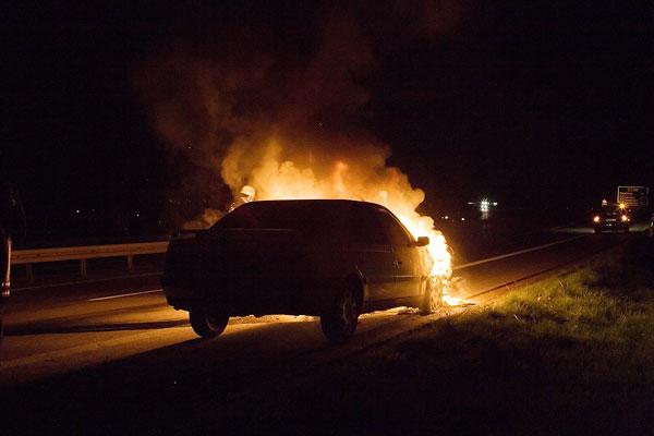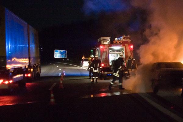 Eppelborn. Der Fahrer eines Peugeot befuhr am Abend des 02. April 2007 mit seinem Fahrzeug die Autobahn A1 in Richtung Saarbrücken, als ihn ein überholender Fahrer auf starke Rauchentwicklung an seinem Fahrzeug aufmerksam machte. Er konnte das Fahrzeug gerade noch kurz hinter der Anschlussstelle Eppelborn auf dem Standstreifen zum Stehen bringen und den mitgeführten Anhänger abhängen, bevor der vordere Fahrzeugteil in hellen Flammen aufging.