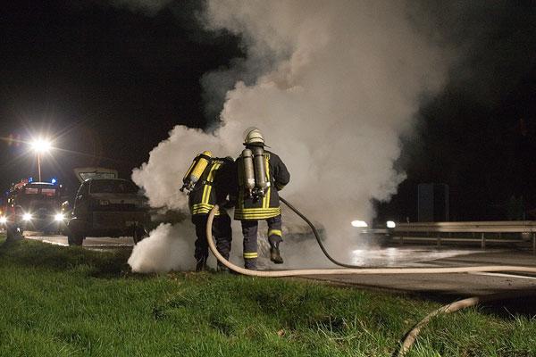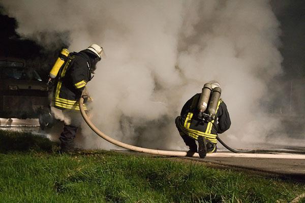 Beim Eintreffen der Feuerwehr stand der gesamte Motorraum des Wagens in Flammen. Mit Löschschaum gelang es den Einsatzkräften schnell, das Feuer unter Kontrolle zu bringen und das Fahrzeug zu löschen. Wegen der starken Rauchentwicklung mussten die Löscharbeiten mit Atemschutzgeräten durchgeführt werden.