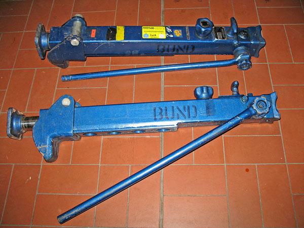 Beschreibung: Bei dem Hydraulik-Hebezeug „Büffel“ sind die Handpumpe und der einfachwirkende Hubzylinder zu einem Kompaktgerät zusammengefasst. Druckbegrenzungsventile verhindern eine Überlast während des Hubvorgangs. Die Anhebeklaue ist 5-fach höhenverstellbar. Der Pumphebel kann in die jeweilige günstigste Arbeitsstellung gebracht werden.