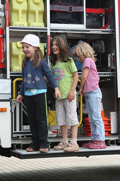Gemeinsam mit vielen Helfern führe Löschbezirksführer Felix Becker die Kinder im Feuerwehrgerätehaus herum und zeigte auch Fahrzeuge und Ausrüstung der Feuerwehr. Doch ganz besonderer Höhepunkt war bei den hochsommerlichen Temperaturen natürlich das Wasserspritzen und selber einmal Feuerwehrmann sein.