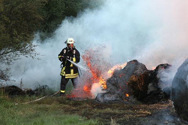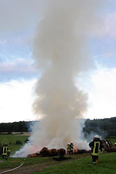 Bis zum Aufbau der Wasserversorgung beschränkten sich die Einsatzkräfte darauf, ein Übergreifen der Flammen auf benachbarte Hecken und noch nicht in Mitleidenschaft gezogene Rundballen zu verhindern. Erst dann konnten die brennenden Ballen gelöscht werden. Wegen der starken Rauchentwicklung mussten die Feuerwehrleute einen Großteil der Arbeiten unter Atemschutz erledigen.