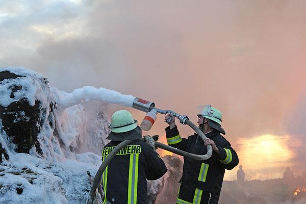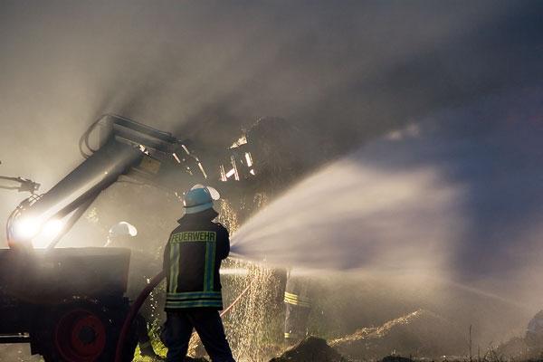 Um ein nochmaliges Aufflammen der Strohreste zu verhindern, wurde zum Schluß ein Schaumteppich aufgebracht. Die Löscharbeiten zogen sich noch bis weit nach Mitternacht.