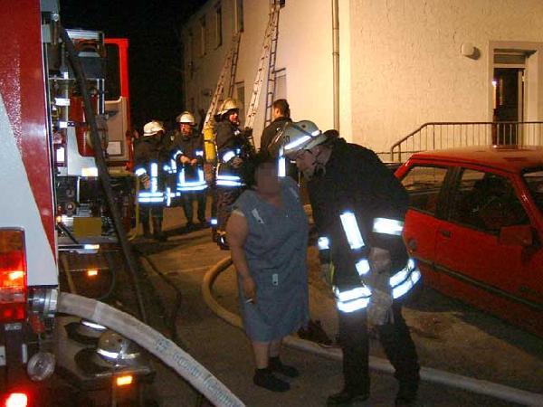 Beim ersten Erkunden zeigten sich weder Rauch- noch Flammenerscheinungen. Beim Vorgehen ins Treppenhaus drang dem Einsatzleiter dann aber dichter Rauch entgegen. Anwohner teilten den ersten Einsatzkräften aufgeregt mit, dass eine ältere Frau an einem der Fenster im Obergeschoß gesehen wurde und sich in der inzwischen völlig verqualmten Wohnung befinden soll. Sofort drangen zwei Trupps unter schwerem Atemschutz zur Menschenrettung ins Obergeschoss vor. Zusätzlich wurde der Rettungsdienst mit Rettungswagen und Notarzt zur Einsatzstelle angefordert.