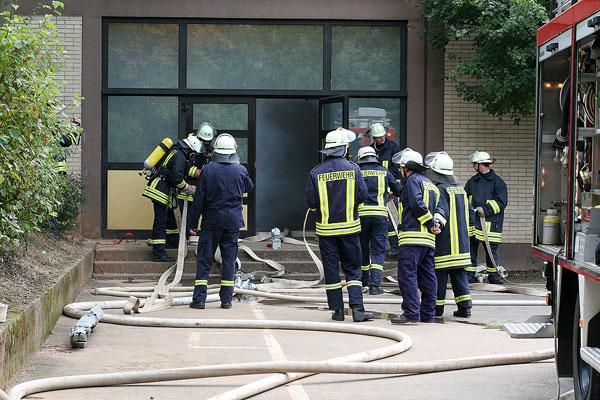 Während vor dem Gebäude Hydranten angezapft und Schlauchleitungen verlegt wurden, drangen die Einsatzkräfte, ausgerüstet mit Atemschutzgeräten in das Gebäude vor, um die eingeschlossenen Personen zu suchen und ins Freie zu bringen. Ein Drucklüfter wurde vor der Eingangstür in Stellung gebracht, um den Brandrauch aus dem Gebäude zu drücken und so den vorgehenden Mannschaften bessere Sicht zu verschaffen. Die Vermissten wurden schnell gefunden und vor dem Gebäude von Sanitätern der Feuerwehr medizinisch versorgt.