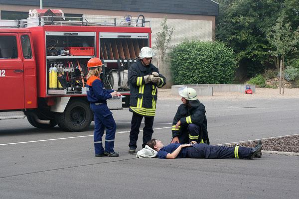 Hier müssen die Löschbezirke Hierscheid und Eppelborn ihr Können unter Beweis stellen. Mit Steckleiterteilen wird das Fahrzeug gegen ein Umstürzen gesichert. Routiniert bringen die Feuerwehrleute Feuerlöscher und Schläuche in Stellung, um sofort eingreifen zu können, sollte das Fahrzeug durch auslaufenden Kraftstoff in Brand geraten. Durch die Heckklappe dringt ein Sanitäter der Feuerwehr in das Fahrzeug vor und übernimmt die Versorgung und Betreuung der Fahrzeuginsassen.