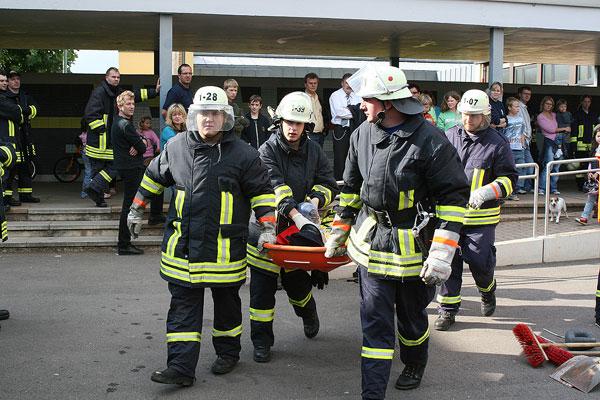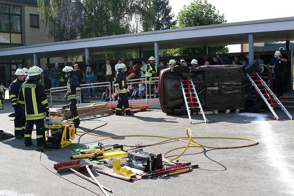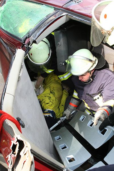 Die Zuschauer bekamen eine sogenannte "patientenorientiert Rettung" zu sehen, bei der die Patienten so schonend wie möglich aus dem Fahrzeug gerettet werden, um weitere Verletzungen zu vermeiden. Mit hydraulischen Rettungsgeräten wurde das Fahrzeugdach abtrennt und Platz für die Rettung geschaffen. Auch diese Übung meisterten die Einsatzkräfte mit Bravour, die eingeklemmten Fahrzeuginsassen konnten in der aufwändigen Befreiungsaktion gerettet und dem Rettungsdienst übergeben werden.