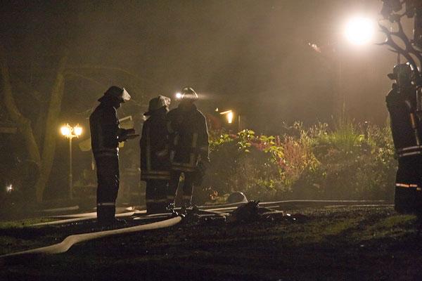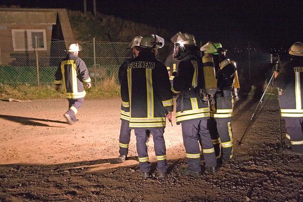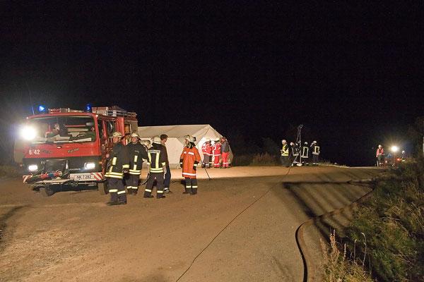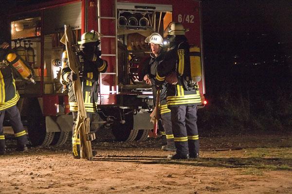 Nicht viele Feuerwehrleute kannten das Anwesen, zu dem sie zur Übung anrückten. Umso schwerer war es für sie, sich in der Dunkelheit zu orientieren. Mit Scheinwerfern wurde die Einsatzstelle ausgeleuchtet, Helfer des DRK errichteten einen Verbandplatz. Ausgerüstet mit Atemschutzgeräten erkundeten Feuerwehrleute das Anwesen und konnten die Verletzten in die Obhut des DRK übergeben. Wegen der Ausdehnung des Brandes wurde auch der Löschbezirk Wiesbach zur Unterstützung angefordert.