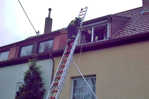 Einsatzkräfte aus dem Löschbezirk Bubach-Calmesweiler trafen kurz darauf mit einem Löschfahrzeug an der Einsatzstelle ein. Eine Schiebeleiter wurde in Stellung gebracht und ein mit Leinen gesicherter Feuerwehrmann versuchte, die Katze mit einem Stock in Richtung einer Dachgaube zu treiben, denn das Dach war durch den Regen rutschig und konnte nicht betreten werden.