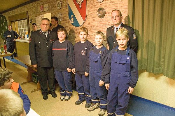 Gemeindejugendbetreuer Karl Paul, Wehrführer Hermann Josef Recktenwald und Fachbereichsleiter Wettkämpfe der Jugendfeuerwehr, Mario Franziski warteten dort bereits auf die Jugendlichen, die sich zusammen mit ihren Betreuern auf den Weg gemacht hatten und nutzten die Gelegenheit, an einige der Jugendfeuerwehrleute das Abzeichen der Jugendflamme zu überreichen.